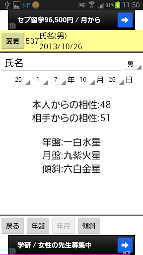 本人の本命星(年盤)、月命星(月盤)、傾斜と、相手の本命星(年盤)、月命星(月盤)、傾斜で、