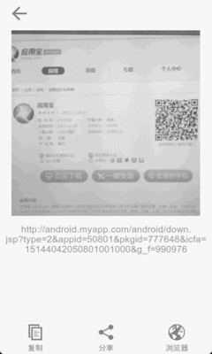 1、二维码扫描,扫描结果可选择复制到剪贴板、或分享截图到其他APP、或用浏览器打开URL地址;