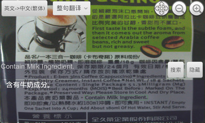 利用手机直接拍摄或导入已有文档图像的方式,自动按用户需要显示词组或整句的翻译结果,识别结果和翻译结果可即时搜索,或通过电邮、短信等方式发送给好友,还能分享至其他SNS社交网站。