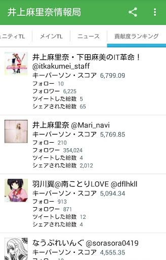 クラスタ内を盛り上げるためにツイートや話題を提供しているユーザーを、シェアされた回数や影響度に応じて、相対的に貢献度をランキングします。ランキングは数時間ごとに更新されます。