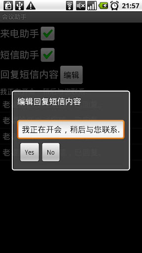 当能打开会议助手的短信和电话助手功能后,可以自动发送短信通知对方您在开会中,让您的会议更轻松。