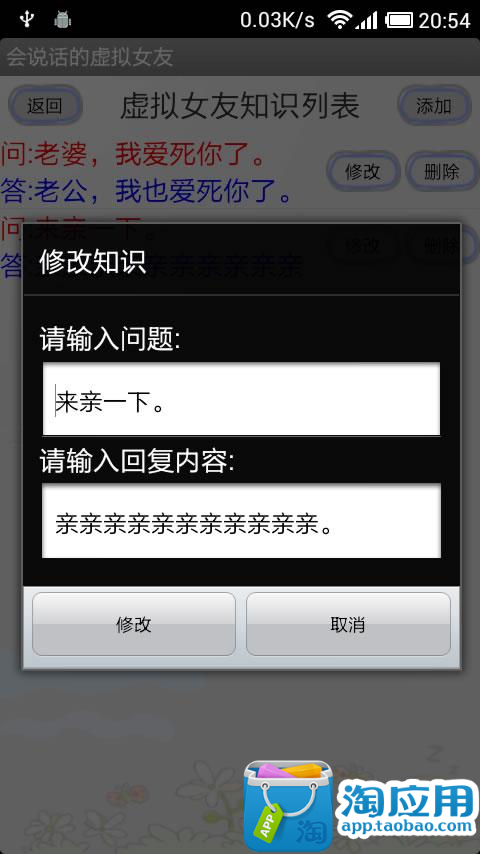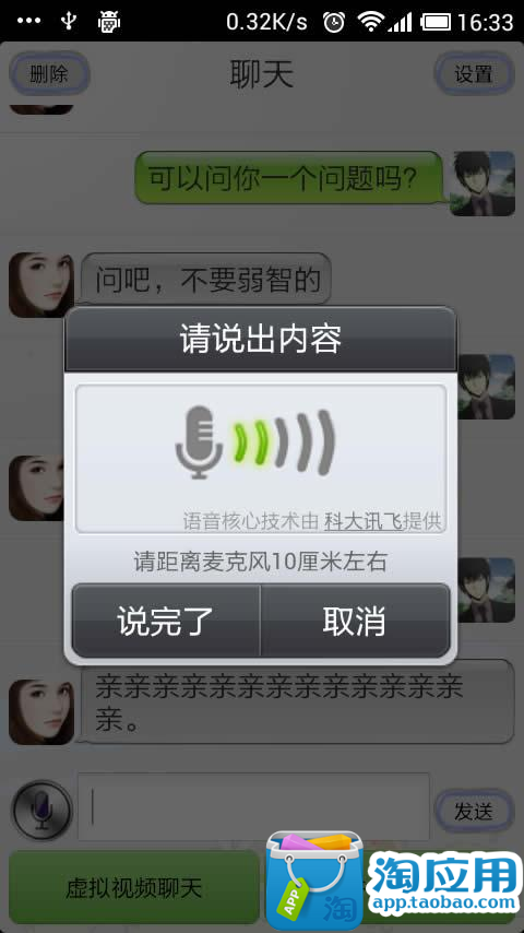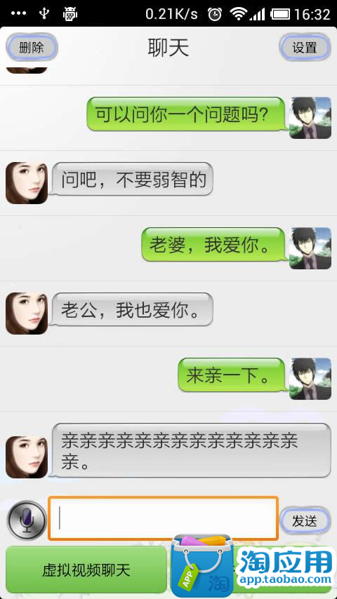 会说话的虚拟女友是一款宅男们都非常喜爱的安卓手机软件,安装了这款软件您就可以把您的手机当成您的女友了,这样您就可以和虚拟女友进行语音聊天了。