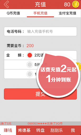 > 攒够了足够的金币后,就可以兑换话费、Q币、支付宝提现啦。