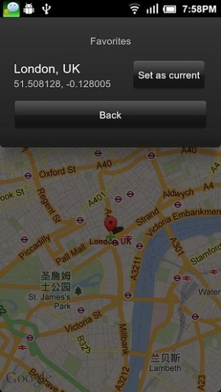 不想让好友知道你的具体位置?不想让陌生人随意就找到你?还是想整蛊一下他/她?现在,安装本软件,解决你前面的所有烦恼.本软件可以随意设定一个地理坐标位置后,发送给你的好友,告诉他你在那里,然后让他/她自己找去吧!(娱乐有限,请小心使用)针对开发GPS相关应用程序的开发者,这是一个利器,可以免除到户外不停的去测试。 重要:1. 需要开启'允许模拟地点': 系统设置->应用程序->开发2. 关闭'使用无线网络': 系统设置->位置和安全3. 在运行其他应用程序之前开本程序,先模拟。否则将会使用默认的GPS传感器,而不是Mock GPS的。