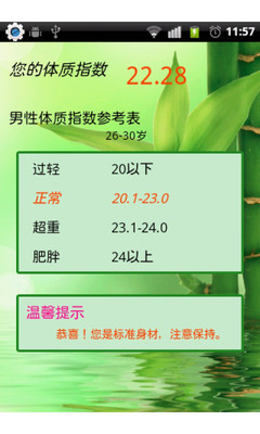 19世纪中期,比利时通才凯特勒提出体质指数这个概念,他定义[体质指数(BMI) = 体重(kg) ÷ 身高(m) ^2],本应用就是基于该理论制作。体质指数(BMI),是目前国际上常用的衡量人体胖瘦程度以及是否健康的一个标准。适用范围:18至60岁的人士,儿童、发育中的青少年、孕妇、乳母、老人及身型健硕的运动员除外。