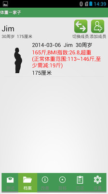 体重一家子是一款适合中国人一家子的体重管理android程序,它适合所有不同年龄的人使用. 它能够测试您和家人的体重是否正常,轻了或重了多少斤,测试结果存档,体重改善信息,目标体重设定,行动日志.它可以帮助您随时了解自己和家人的体重状况和打造健康身体助一臂之力,值得您的拥有!