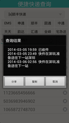 如EMS快递、顺丰快递、申通快递、圆通快递、中通快递、韵达快递、天天快递、汇通快递、宅急送快递、CCES、华宇物流、速尔快递、优速快递等,更多快递请查看应用内容。