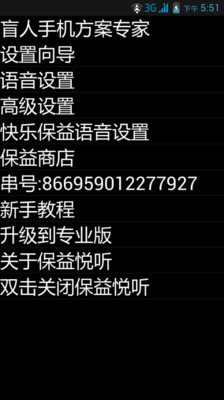 安装保益悦听并在系统辅助功能设置中激活后就会把智能手机转化为盲人可以独立操作使用的语音提醒模式,在此操作模式下可以用单指触摸屏幕,与此同时保益悦听会通过TTS语音技术播报当前触摸的内容,如需执行,可以在屏幕任意位置双击激活当前选择的项目;拖列表或者翻屏需要双指按在屏幕上左、右或者上、下拖动,同时会有相应的语音提示。