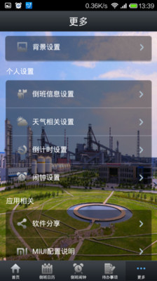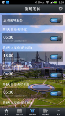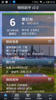 倒班助手v2.0版本采用全新的UI,软件界面更加的美观,同时新增了倒班闹钟、倒计时、待办事项、天气信息等实用功能。内置了首钢京唐公司、首钢迁钢公司、首钢首秦公司、首钢矿业公司、首钢冷轧公司五个钢铁基地的倒班信息,支持自定义倒班规则设定,适用于所有倒班人员。另外软件增加白班模式,非倒班人员也可以使用。