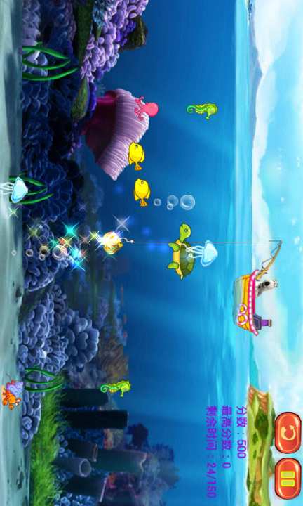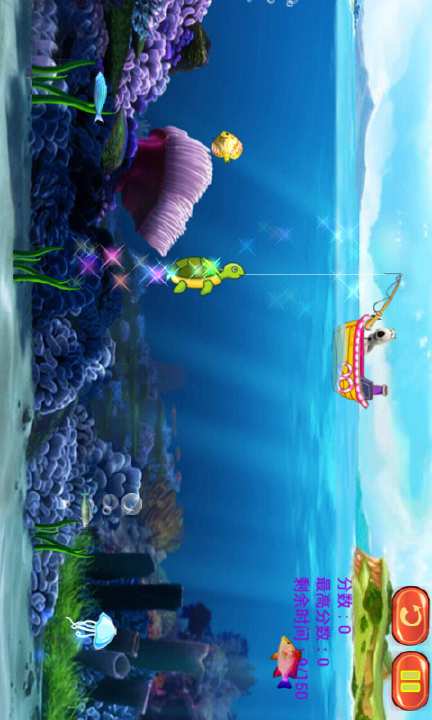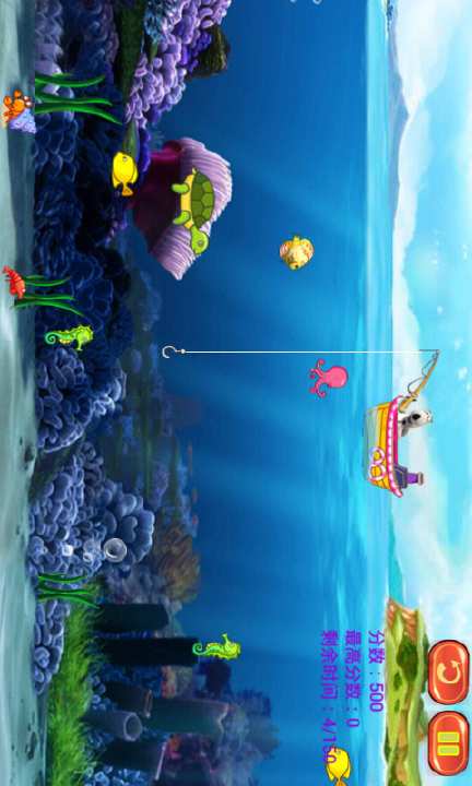 倒霉熊开着船出深海钓鱼啦,玩家在游戏中用各种钓钩钓多达12种鱼类,从小巧的梭边鱼,到大型的鲨鱼,金黄色的热带鱼,看看有没有美人鱼。当你钓起一只鱼,分数相应会增加,并有时间奖励。不同的鱼,有不同的分数。你可以一次钓起多条鱼哦,玩家将体验到前所未有的爽快感。利用重力感应移动船只,同时敏捷的放线,拉线,是成功的关键。