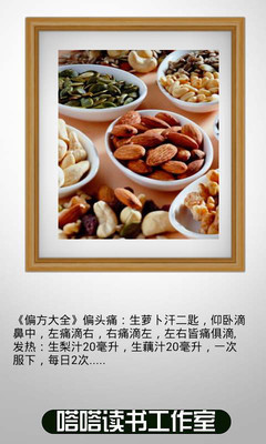 偏头痛:生萝卜汗二匙,仰卧滴鼻中,左痛滴右,右痛滴左,左右皆痛俱滴。