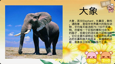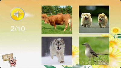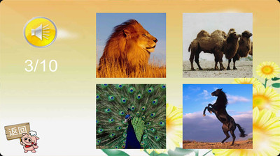 2、分为学习模式和测试模式。学习模式包含动物的图片以及简单的介绍,点击图片还可以发出动物的叫声;测试模式让孩子根据动物的叫声来选择对应的动物,开发孩子的智力。