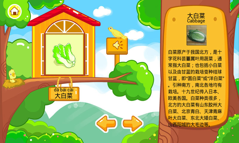 游戏中包含了十多种常见蔬菜的卡通形象和真实照片,点击旁边的小喇叭会播放蔬菜的中文发音。点击左右按钮更换动物。