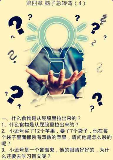 脑筋急转弯大全及答案收录了最新3600道脑筋急转弯题目,内容包括益智类、搞笑类、数学类;脑筋急转弯不只是一种娱乐方式,更能帮你突破思维定势,让你的脑子更灵活...