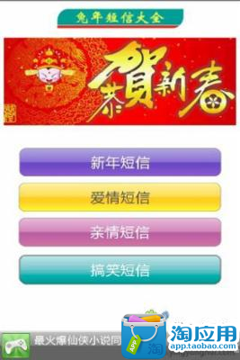 兔年短信大全、提供最新、最流行的兔年短信、爱情短信、亲情短信、搞笑短信、界面优美、方便操作。