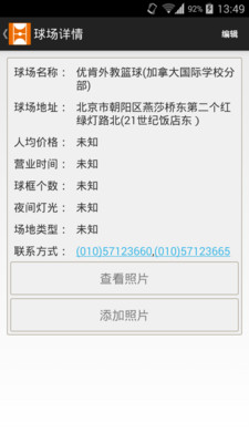 专门为球场优化过的信息展示,专属篮球场的信息:篮筐个数,场地灯光,收费情况等。
