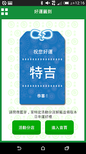 每日可擁有一次抽籤機會,出遊、考試、事業、戀愛,無論大事小事,都來試試妳的運氣吧!抽籤完畢可至FamilyMart特定店家解籤領取優惠獎勵
