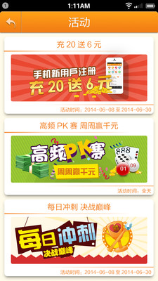 2.高频PK赛,周周赢千元:每周对所有参加11选5、快3高频彩的用户进行盈利PK,盈利最多的前10名用户给出2000元奖金,单人最高1000元。
