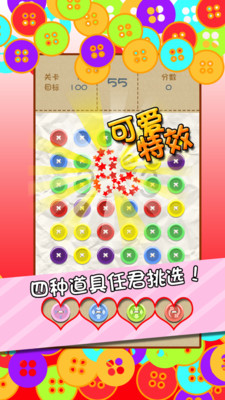 ※玩法※:连接相邻同色纽扣,即可消除,环形消除时,同一颜色所有纽扣全部消除且三倍分数,具体可参照游戏首页新手教程。
