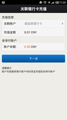 2、 通过刷卡和关联银行卡对全球付账户进行充值。