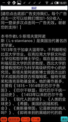 作者文笔隽永、笔力深厚、才思横溢,整部著作前后一贯。 近年来,在作全球观点或包含全于内容重新进行世界史写的尝试中,最具有推动作用的那些著作恰恰是由历史学家个人独立完成的,其中以斯塔夫里阿诺斯的《全球通史》最为著名。
