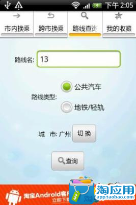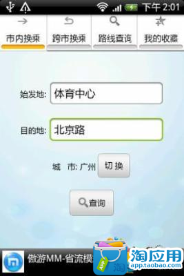 输入出发地和目的地的名称(如地名、路名、建筑物、公交车站等)和选择城市,本应用将为您提供合适的乘车指引,灵活地提供各种交通工具间的乘车路线,并提供公交路线查询与分享查询结果。