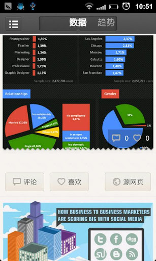 只需要一滑一拉动动手指, 就能获取有价值的信息, 你可以点击喜欢收藏你喜欢的信息, 可以发表简单地评论,
