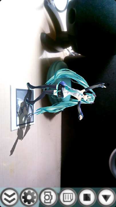 MikuMikuAR是有爱的Miku粉丝制作的一个扩展现实的应用,它可以通过识别一张叫做“AR卡”的卡片的图案,把三维的模型即时地融合到手机摄像头画面中。应用第一次运行以后,会把一张图片拷贝到SD卡根目录\MikuMikuAR\print.jpg这个位置,把它打印出来(彩色或是黑白均可),然后把手机摄像头对着这张图片,让整张图片出现在画面中,就能看到三维模型站到了图片上。点播放按钮,模型就开始跳舞了。如果不方便打印,把这张图片显示到电脑屏幕或是其它手机的屏幕上,也是可以的。