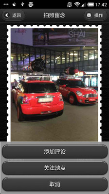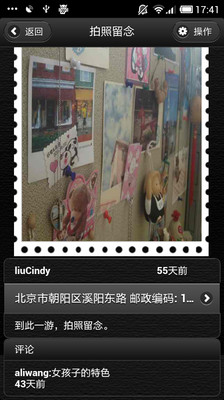 浏览:可以浏览你当前位置范围内(远、中、近),到过此地的朋友和发布的「拍照留念」作品,还可以发表你的评论。