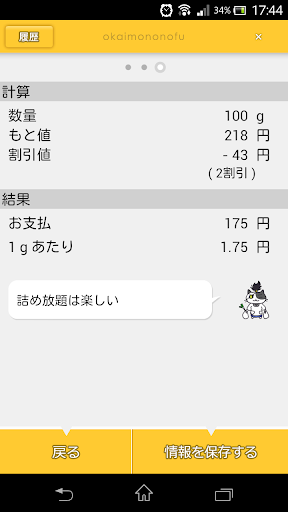 ■おかいもののふ(Free)は、単価計算がかんたんにできるアプリです。さらに割引計算と%OFFの計算も可能、すぐにお得な商品を見分けることができてお買い物が楽しくなります。割引計算の結果画面で侍ネコのもののふくんがてきとうにしゃべります。