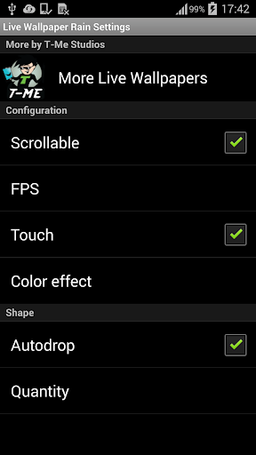 您可以增加元素的大小、速度,或者密度,还可以选择三种不同的颜色效果和三种不同的颜色强度。若要自定义,打开应用,点击“设置Live Wallpaper”,然后点击“设置”