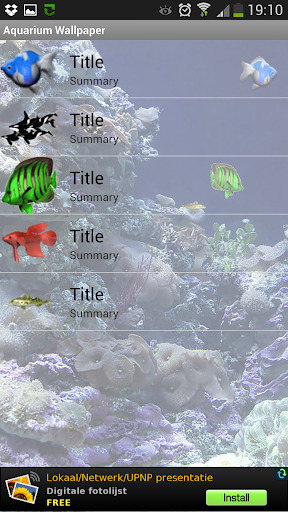 一個美麗的動態壁紙水族館,你會看到魚兒游動在你的屏幕上,一個美麗的背景。在菜單'選項,你可以選擇在那些可供游泳的魚。如果你喜歡的動畫背景,購買專業版,在菜單'沒有廣告。我們建議評估的應用和未來的改進。