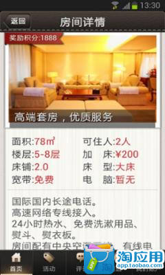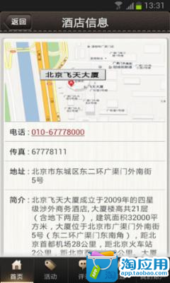 北京飞天大厦详细介绍,酒店房间预订,酒店特色服务介绍,酒店活动的发布,酒店评论,酒店周边景点的介绍,以及地图导航等等。用户可以用此应用直接了解酒店信息,直接预订酒店,享受全网最低价!