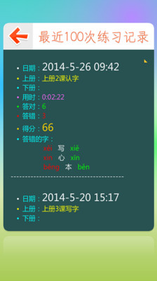 4、练习模式可进行计时、打分、记录错误,并保存有最近100次的练习历史记录;