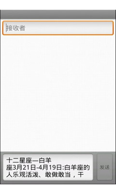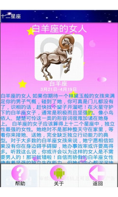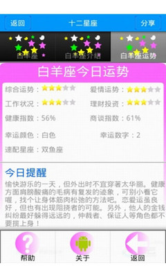 每一个星座都有属于自己的个性,每个星座也有优缺点。想知道自己属于哪个星座吗?想了解对方是什么星座吗?想更深刻的了解对方的性格特点吗?该应用以十二星座为素材,展示每个星座的不同个性,可以把自己的星座或者其他星座的特点通过短信、微博等方式分享给大家。该应用展示出每一天每一个星座不同的类别,包括健康指数、工作状况、理财、今日提醒...,一娱乐为主,供大家参考。