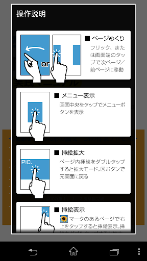 本アプリの操作方法につきましては、画面中央部のタップで画面上部に表示されるメニューバー右端の“?”マークをタップして頂くと、 操作説明が表示されますので、そちらをご覧下さい。