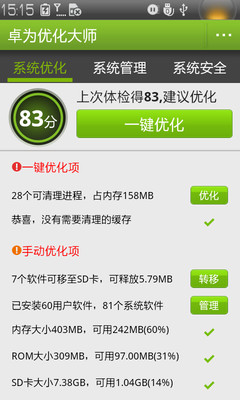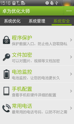 卓为优化大师,拥有手机安全,优化,管理等高效率功能,让您真正做到省心,放心的好软件。