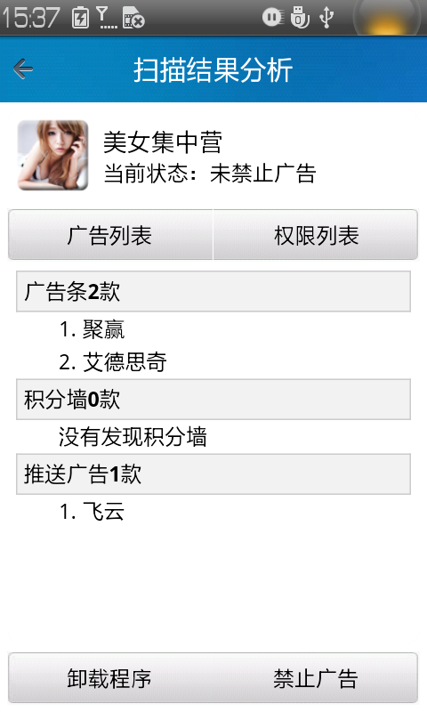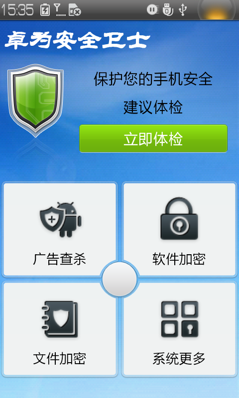 卓为安全卫士是一款免费的手机安全软件,为您提供广告查杀,权限扫描,文件加密,软件加密等实用功能。主要功能:1、恶意广告扫描,恶意广告查杀,防止恶意软件后台下载。2、敏感权限扫描,防止恶意软件窃取隐私。3、文件加密,可以对txt,word,图片等任何文件加密。4、程序保护,可以对短信程序,相片查看程序等任何软件进行加密。提示:如果您在使用过程中有什么问题,请点击反馈按钮给我们意见或者建议。