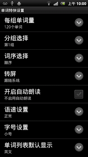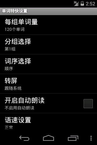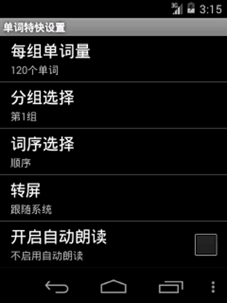 用[设置]选择您要背的单词分组,设置每组单词量,语速,词序等等;