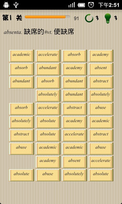 该款软件适用于在学习英语的朋友,一种崭新的玩游戏学英语方式,分为关卡模式和录入模式,用户可以录入自己的英语生词库也可以选择关卡模式,用户如果全部通过449关的话,您的英语能力应该会突飞猛进,用户在玩游戏当中又可以学单词记单词,两者不误。
