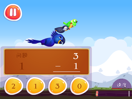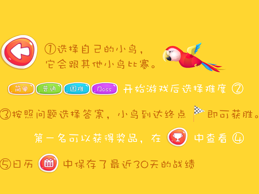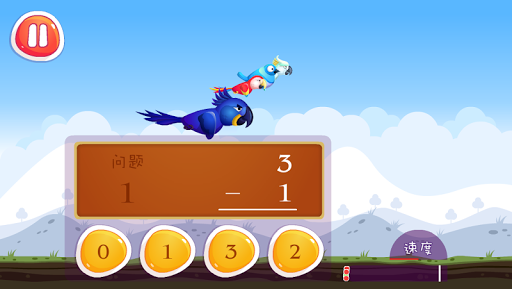 遊戲以小鳥的飛行比賽的形式,讓孩子練習算術,計算越快,小鳥就飛得越快,每次玩一組加法測驗,回答錯誤的題的答案將會被列出,完成比賽會獲得名次,如果獲得第一名還會有寵物的獎勵噢。不同難度會有不同獎勵,總共八種寵物。