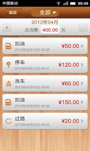 01.消费类型:包含加油、洗车、停车、过路、保养、维修、违章、饰品、配件、车贷、车险等费用类别;