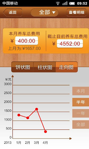 05.养车费用报告:报告当月的各项开支,并智能转换为饼状图、走势图,花销走势一目了然
