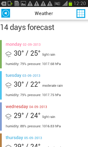 随着天气插件,你可以设置任何城市或地区(如雅加达或巴厘岛), 以获得实际的天气。天气是在您的手机在离线模式下所有可用的时间。 REALY很好,因为你并不需要支付互联网连接和漫游。