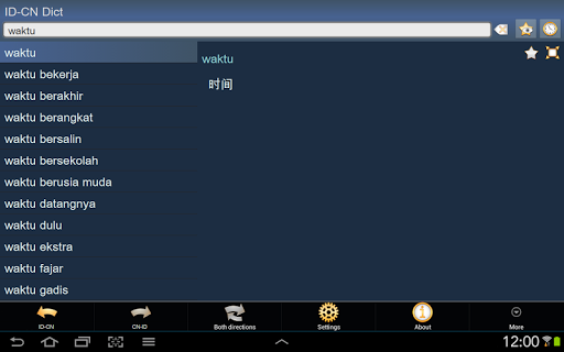 这是 印尼语 - 中文 以及 中文 - 印尼语 字典; Indonesian - Chinese Simplified and Chinese Simplified - Indonesian dictionary / Kamus Indonesia - Mandarin dan Mandarin - Indonesia。该字典可离线使用,不需要互联网连接。