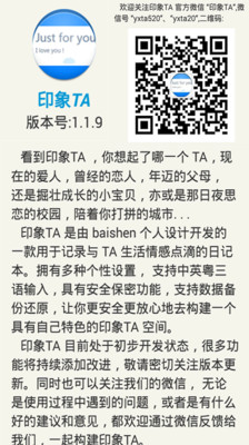 印象TA 是由 baishen 个人设计开发的一款用于记录与 TA 生活情感点滴的日记本。拥有多种个性设置,支持中英粤三语输入,并且具有安全保密功能,支持数据备份还原,让你更安全更放心地去构建一个具有自己特色的印象TA 空间。