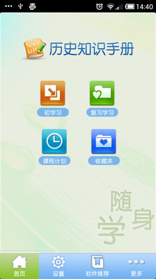 历史知识手册(高中)是一款由天渔教育研发的高中历史知识记忆软件,针对的是高中历史用户。参照高考考点对高中课本知识点归纳整理,帮助考生记忆,用更少的时间掌握更多的知识。 特色: 1. 权威的学习资料,让您省时省力。 2. 科学高效的学习方法,助您轻松闯高考。 3. 丰富的学习方式,让学习更有趣。 产品特性: 1.轻松记忆:按专题归类,方便查找,让您轻松记忆知识点。 2.学习计划:可根据学校进度,调整学习计划。 3.移动学习:目前支持安卓系统,让您随时随地轻松学习,未来将逐步实现kjava、symbian、iphone等系统,让您的学习计划随身定。 4.便于管理:独特的词汇收藏夹,让随时把要重点记忆的知识点,统统收进来,方便你下次学习。 5.精心挑选:历史内容高品质保持,名师筛选,全面提升您的应试能力。