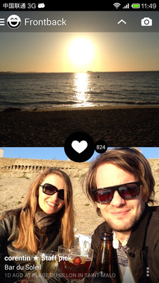 Frontback是一款通过手机前后摄像头拍照的应用,首先通过前置摄像头进行拍照,然后再通过后置摄像头进行拍摄,然后将前后拍摄的两张照片进行合成分享到你的社交网络上。