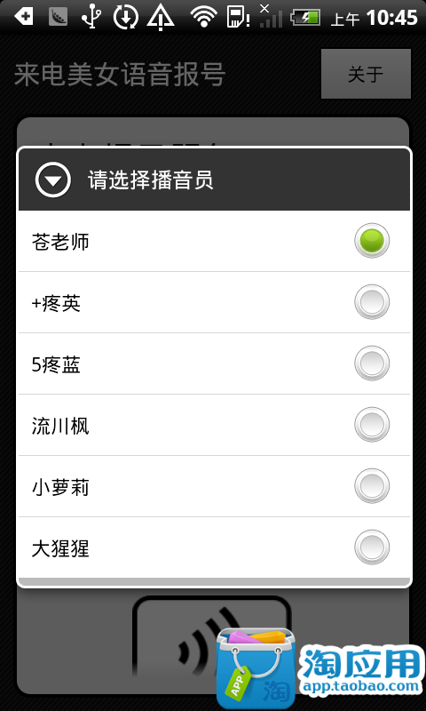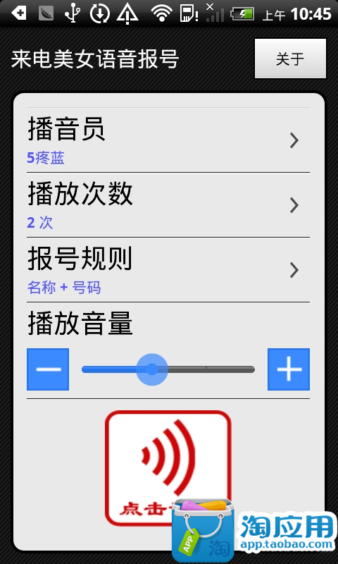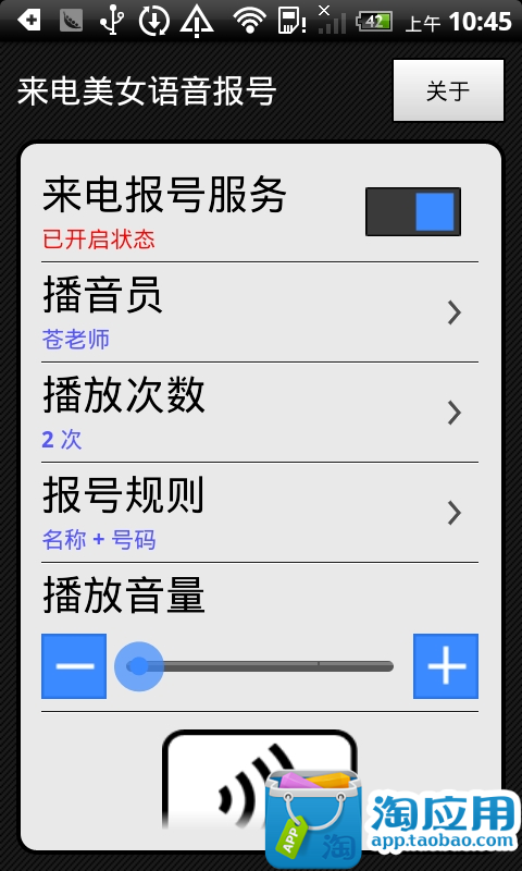来电美女语音报号支持来电自动报出联系人名字、联系人号码,让您无需拿起手机即可知道来电联系人身份!特性1、无需下载语音引擎2、提供6位女声优选择3、可定义来电播报项目4、无需联网、永久免费5、支持Android1.6以上固件,自适应分辨率