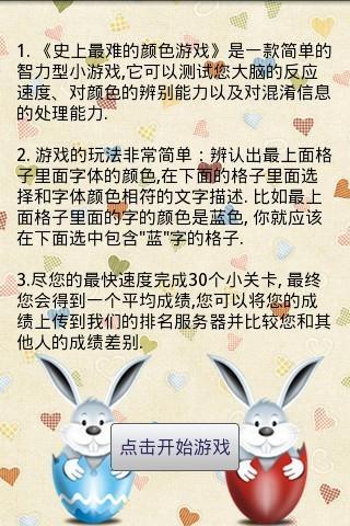 游戏的玩法非常简单:辨认出最上面格子里面字体的颜色,在下面的格子里面选择和字体颜色相符的文字描述. 比如最上面格子里面的字的颜色是蓝色, 你就应该在下面选中包含 蓝 字的格子。尽您的最快速度完成30个小关卡, 最终您会得到一个平均成绩,反应快就让平均成绩在0.5秒以下吧。